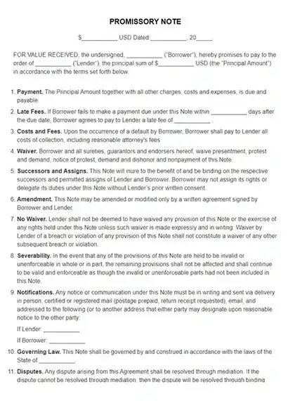 Life happens, and sometimes borrowers miss deadlines. Without rules in the note, there's no agreed way to handle late payments. Even a simple line like "$25 late fee after 10 days" makes expectations clear.